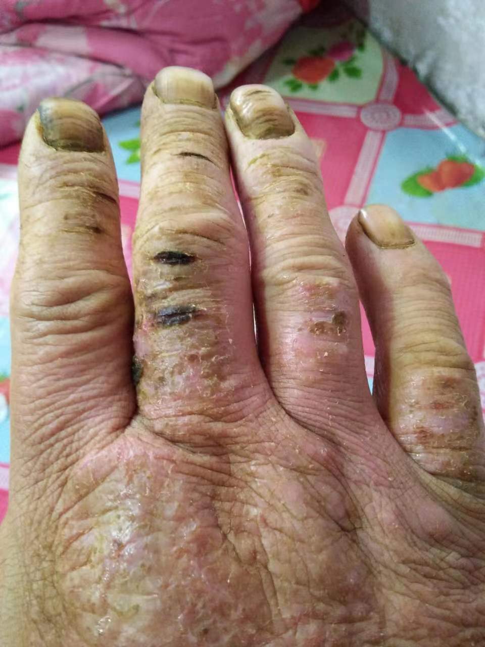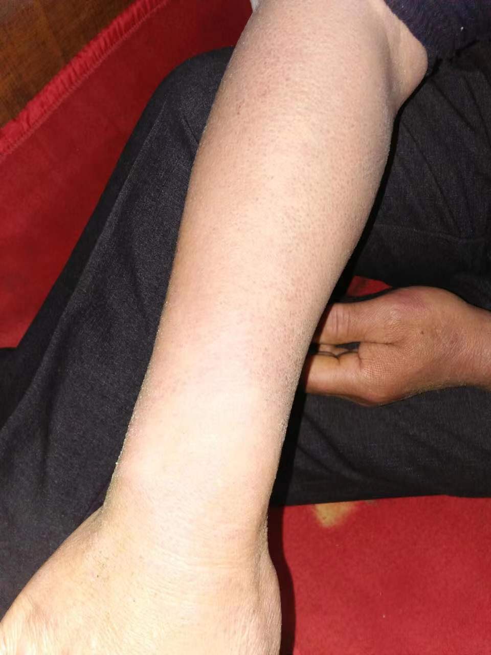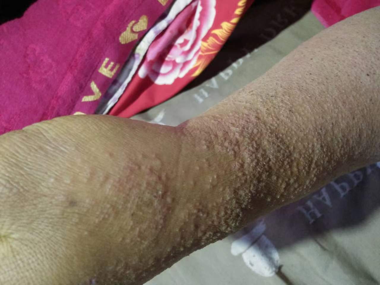 此为慢性湿疹,其实慢性湿疹是比较常见的一种皮肤病,但是一般症状都会相对较轻。我选用了一个比较典型手臂症状较严重的的患者给大家分享。此病症不光手臂上,其它身体部位也会有,比如腿部、手,脚、肘窝、外阴、肛外等处,往往两侧对称发病。病程一般时间较长,可持续数年反复发作。瘙痒症状常常呈阵发性,时轻时重,有时持续数月甚至更久。形态也各样,可表面为暗红色斑片或斑块,上面有丘疹、鳞屑、血痂等。也可能会导致皮肤增厚,表皮粗糙,有时伴有色素沉着或减退的症状。像这种大面积呈现的患者一般相对来说比较自卑,特别是夏季,很少会穿短袖短裤直接暴露在外的。