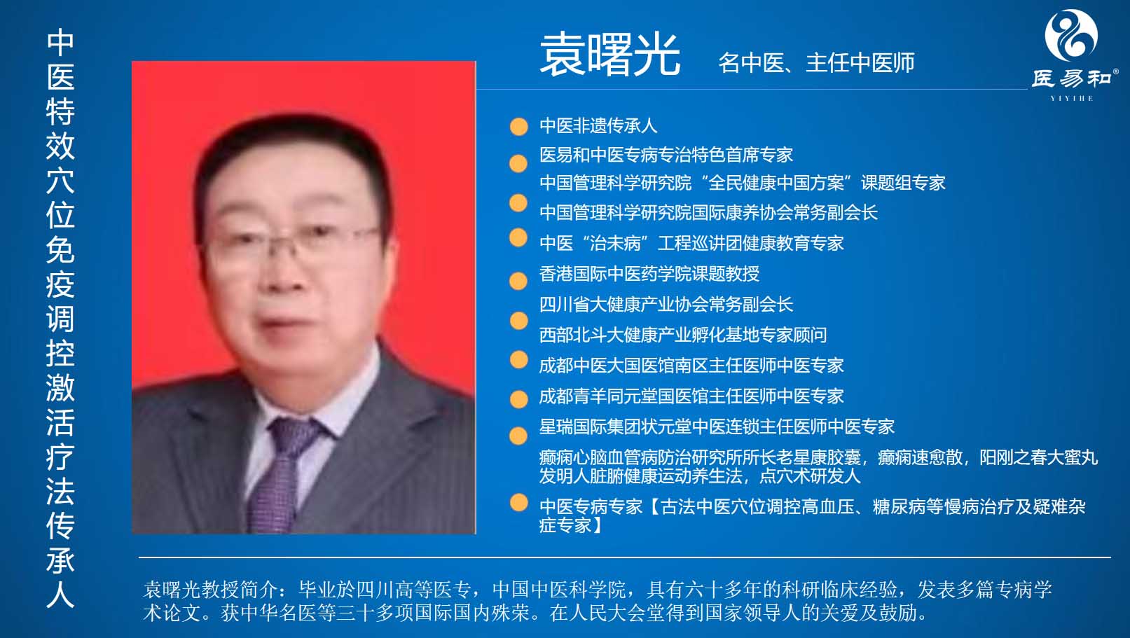 袁曙光79岁,主任医师,教授;毕业於四川高等医专,中国中医科学院,具有六十多年的科研临床经验,先后任三台,绵阳,台湾新竹,成都白龙堂等多家医院院长。发表多篇专病学术论文。获国际国内四项金奬,一项铜奬,四川省健康扶贫工程爱心大使水晶奬,中华名医,二十世纪中华英才人物等三十多项国际国内殊荣。在人民大会堂受到国家领导人的亲切接见并合影。业绩已载入中国专家大词典,二十一世纪人才庫,国医人物(名家篇),疫情下的中医魂,等大型重量级书籍。