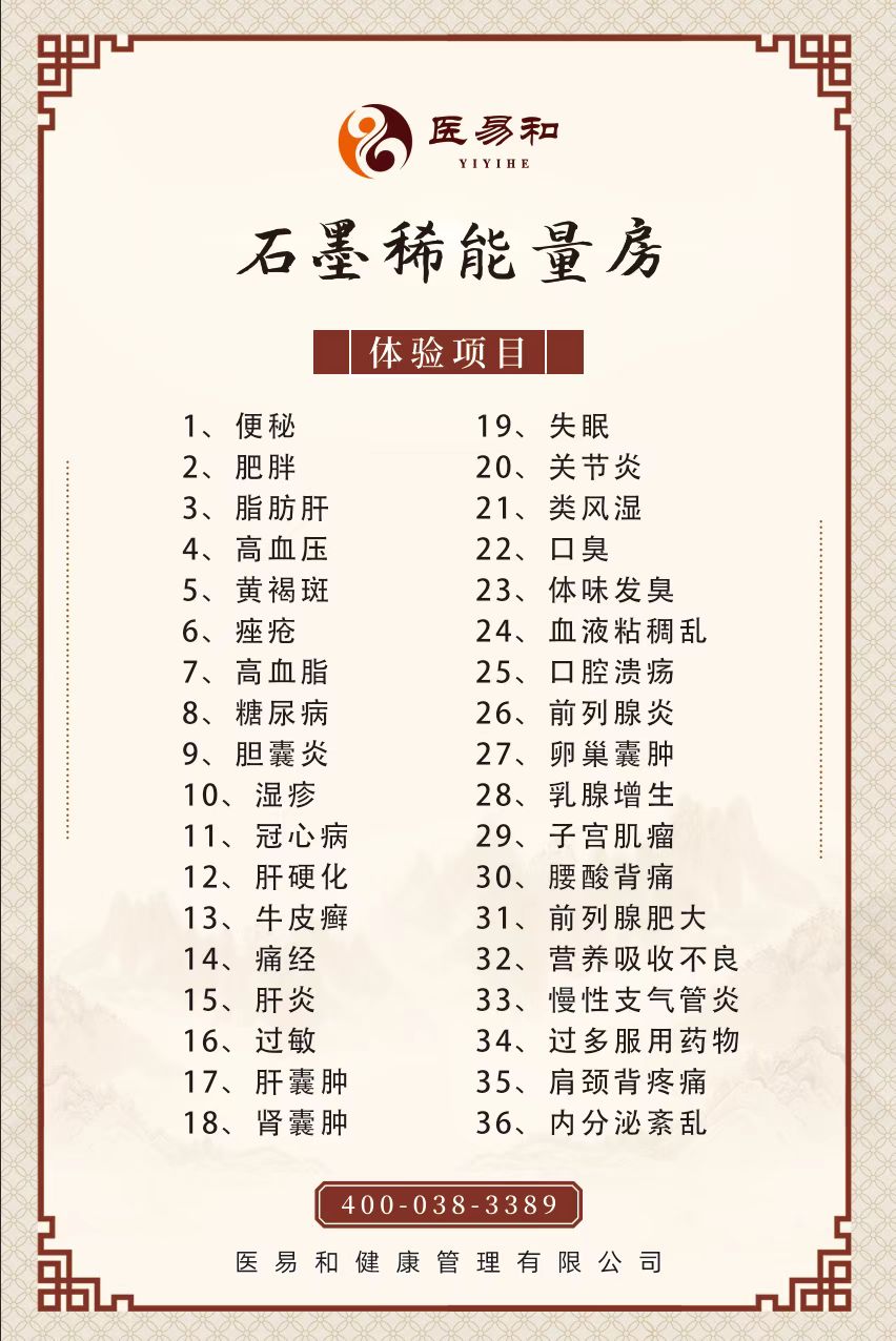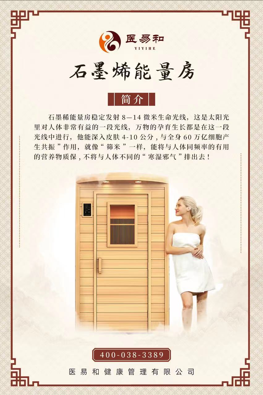 医易和石墨烯远红外能量房,分为单人、双人房,整体尺寸更大,宽敞又舒适,可以和家人一起进行家庭理疗,360°环绕的纯石墨烯远红外照射,3秒快速升温,可促进血液循环和脂肪的燃烧,有助身体毒素的排除,疏经通络,祛湿除寒,有效改善睡眠。据分析,在石墨烯远红外能量房汗蒸30分钟,相当于10次的全身按摩,相当于45分钟淋巴排毒,相当于1小时全身经络疏通,相当于500次有氧扩胸运动,相当于排出4.1克内脏毒素,相当于做一次全身脏腑SPA。