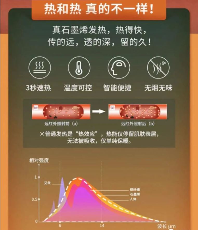 广西中医药大学第一附属医院研究表明:石墨烯无烟艾灸的治疗作用与赵氏雷火灸条相当。研究表明,石墨烯释放的远红外频率与人体细胞分子、原子间的水分子运动频率非常接近,其能量最高且易被人体吸收, 因此会引发远红外共振和非热效应。石墨烯发热 膜充分利用了石墨烯优异的电热转化等性能,照射后能够使局部迅速升温,并且加热后发射6~14 μm 远红外光波,渗透至肌体深层,具有改善局部血液循环、激活生物大分子活性、促进新陈代谢、提高人体免疫功能和消炎镇痛等作用。