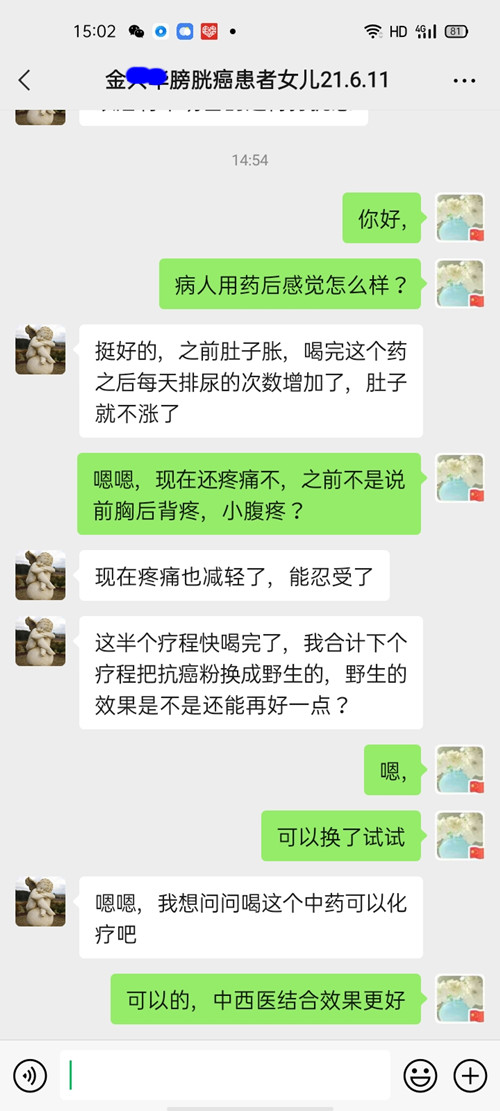 女儿回答:挺好的,之前肚胀,喝药后每天排尿增加,肚子不胀了,疼痛也减轻了,能忍受了!