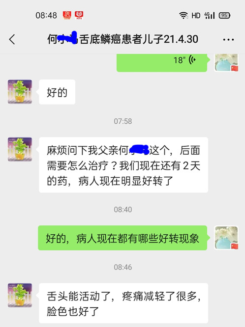 得了舌癌舌根疼,何某用药8天疼痛就缓解! 患者评价 5月13日 医易和医易和 取消关注 关注 私信 舌癌何某,河北石家庄人,因患者嗓子疼确诊舌癌一周,患者右侧腮腺位置疼痛,舌头疼,不思饮食,小便疼痛且解不净,舌根处肿块疼痛,且舌头不能活动,影响进食。医易和纯中医专病专治,八大癌症肿瘤王(治癌王)治疗张中海主任根据患者病情制定治疗方案,患者用药8天后,疼痛减轻,不思饮食缓解。 儿子说吃药8天后舌头能活动了,疼痛减轻了很多,脸色也好了!