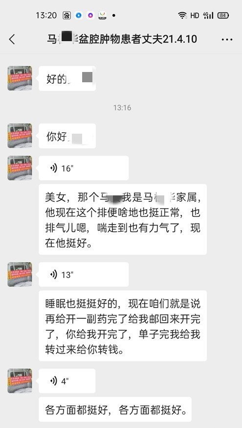 卵巢纤维瘤马某疼痛难忍,用药6天后疼痛减轻! 患者评价 5月13日 医易和医易和 取消关注 关注 私信 卵巢纤维瘤马某:黑龙江巴彦县人,卵巢纤维瘤做过两次手术,半年前出现腹腔、盆腔、肝脏等多发转移,广泛累及乙状结肠,讲解肠系膜,乙状结肠系膜,腹膜后、输卵管组织等,就诊时患者肝区能摸鸭蛋大小肿块,肝区疼痛,左侧腹部疼痛,肚脐周围疼痛,排气不好,医易和纯中医专病专治,八大癌症肿瘤王(治癌王)治疗张中海主任详细了解患者病情以后制定治疗方案,患者遵医嘱用药6天后,疼痛减轻,排气正常,丈夫说现在各方面都挺好的。