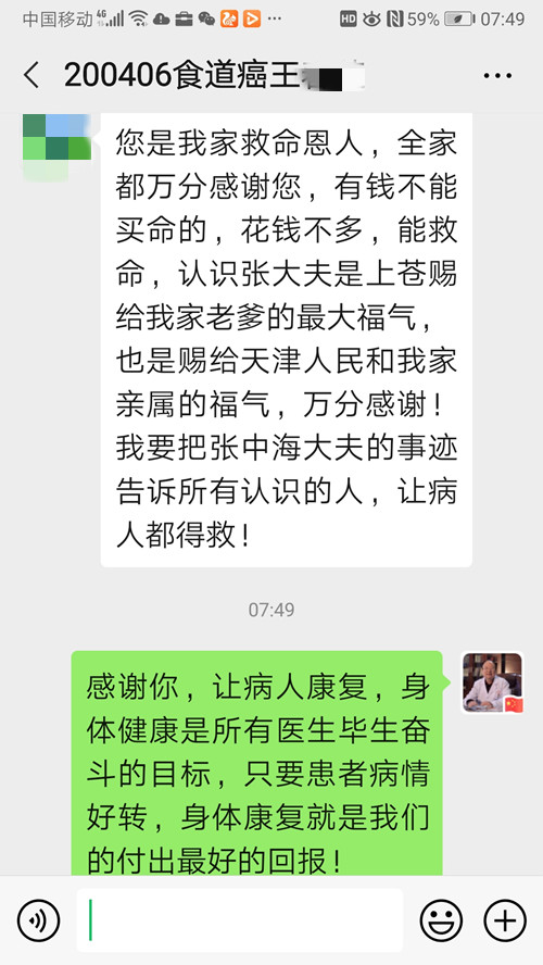 女儿发来微信说:您是我家救命恩人,全家都万分感谢您,有钱不能买命的花钱不多,能救命, 认识张大夫是.上苍赐给我家老爹的最大福气,也是赐给天津人民和我家亲属的福气,万分感谢!我要把张中海大夫的事迹告诉所有认识的人,让病人都得救!