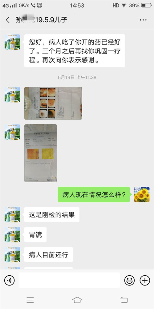 儿子说:病人吃了你开的药已经好了。三个月之后再找你巩固一疗程。再次向你表示感谢,病人目前还行。