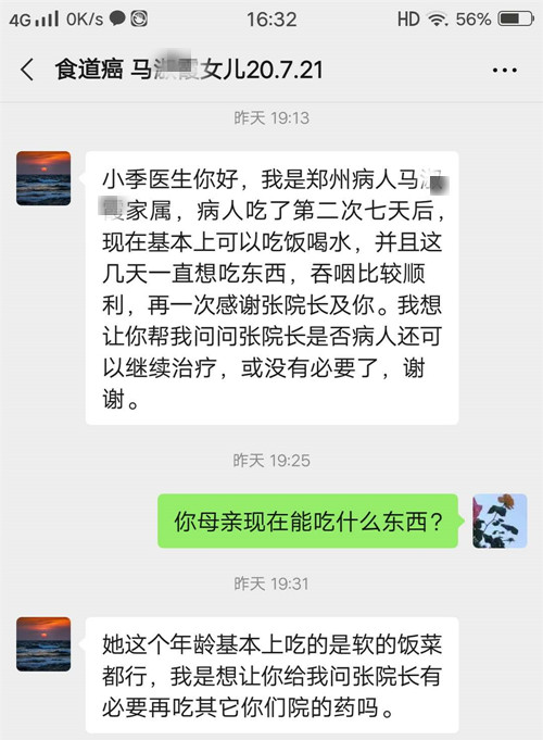 食道癌马某水米难进,用药7天后恢复正常进食 患者评价 5月13日 医易和医易和 取消关注 关注 私信 食道癌患者马某:郑州市二七区人士,因吞咽不利查出食道上段癌5年多,就诊时患者水米难进,只能在家输营养液维持生命,医易和纯中医专病专治八大癌症肿瘤王(治癌王)张中海主任详细了解患者病情以后制定治疗方案,患者遵医嘱用药3天后能水,用药7天后恢复正常饮食。女儿来微信说病人吃了七天后,现在基本上可以吃饭喝水,并且这几天一直想吃东西,吞咽比较顺利,再一次感谢张院长。