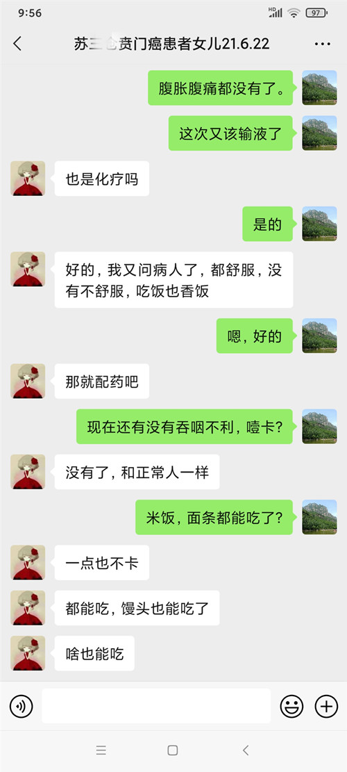 女儿发来微信说病人都舒服,没有不舒服,吃饭也香,没有吞咽不利,噎卡没有了,和正常人一样,米饭,面条都能吃了,一点也不卡,都能吃,馒头也能吃了,啥也能吃。