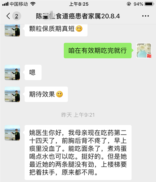 女儿发来微信说:我母亲现在吃药第二十四天了,前胸后背不疼了,早上痰里没血了。