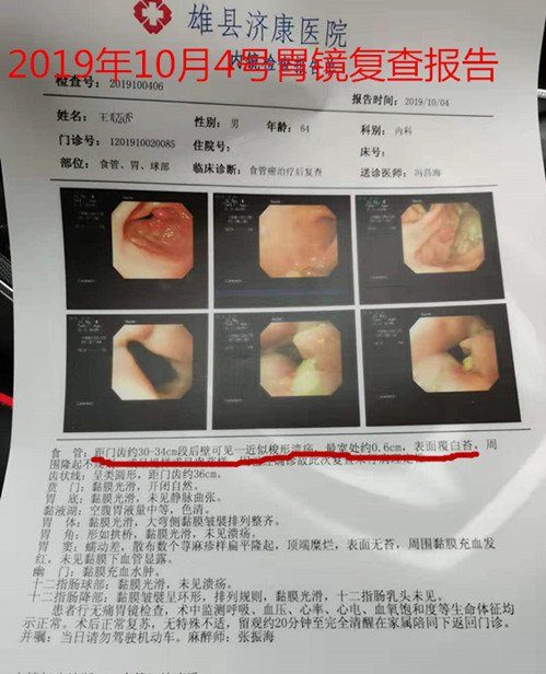 (雄县济康医院2019年10月4日胃镜复查报告)