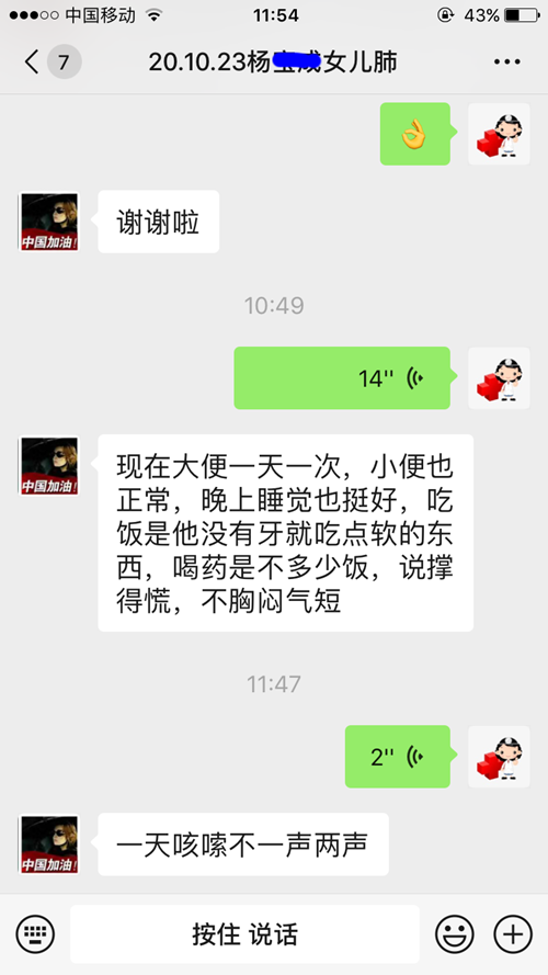 杨某女儿说现在大便一天一次,小便也正常,晚上睡觉也挺好,吃饭是他没有牙就吃点软的东西,喝药是不多少饭,说撑得慌,不胸闷气短,一天咳嗽不一声两声。