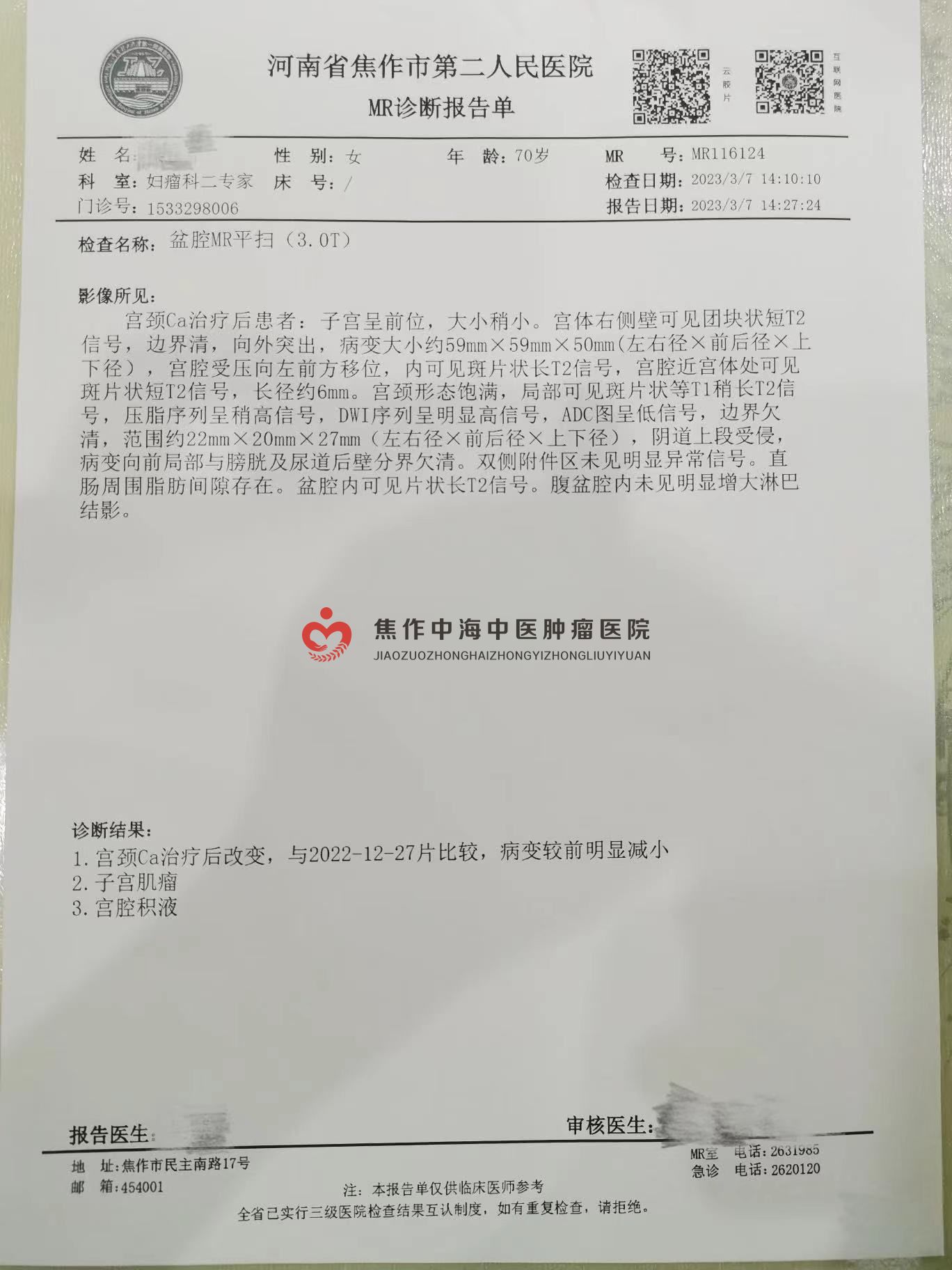 宫颈癌患者秦某:女,71岁,焦作市解放区人。2022年12月份,患者阴道分泌物增多,并伴随小腹疼痛,经当地医院诊断,确诊为宫颈癌,遂做一次化疗。因考虑化疗会产生耐药性,前来我院采用中医治疗。医易和纯中医专病专治八大癌症肿瘤王(治癌王)张中海主任详细了解患者病情后制定治疗方案,患者遵医嘱用药10副后,小腹不再疼痛,阴道分泌物消失,脸色也红润不少,总体呈好转趋势!