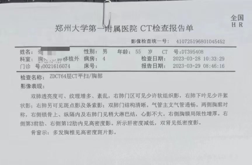 右肺腺癌患者张某:男,55岁,河南省新乡市原阳县人。1年前,张某总是出现反复咳嗽的症状,在当地诊所治疗无效后,去往郑大一附院做了CT检查,结果显示:右肺占位,自述做气管镜病理检查为腺癌。随后,张某做了化疗以及免疫治疗各一次,但自身症状并未得到有效治疗。了解到医易和擅长采用温和、有效的纯中医中药,治疗各种癌症,慕名来我院就诊。医易和名老中医张中海主任详细了解张某病情以后,制定了全面的治疗方案。张某遵医嘱用药80付后,胸闷气喘消失,化疗引起的双下肢无力也得到减轻,双手指尖麻木感消失,免疫药引起的后背红疹也消失了;用药90付后,张某在大医院做了复查,结果显示,肿块在慢慢缩小,骨转移病灶也在减小,具张某描述,自己的各方面已正常,基本没有不适症状。